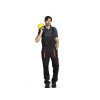 Bib pants, 270 g/m2, canvas, comfortable fit and high resistance, adjustable straps with plastic buckles, stressed points reinforced with polyester 600D, reinforced double knees for inserting knee pads, plaster with three pockets, two front pockets, two back pockets and two side pockets with flaps, reflective details, additional functional compartments for tools, hammer loop, plastic loop for keys, elastic band and buttons inside waist for comfort, identity label inside, three needle stitching and bartaks for extra strength