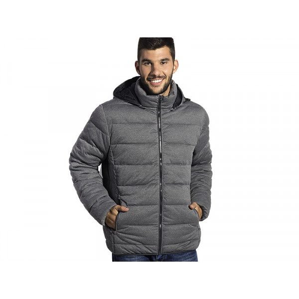 Jacket, padded, high collar, adjustable drawstrings with stoppers in the hood, contrasting zipper tape and lining, two front zippered pockets, elasticated trimming around armholes, hood and bottom