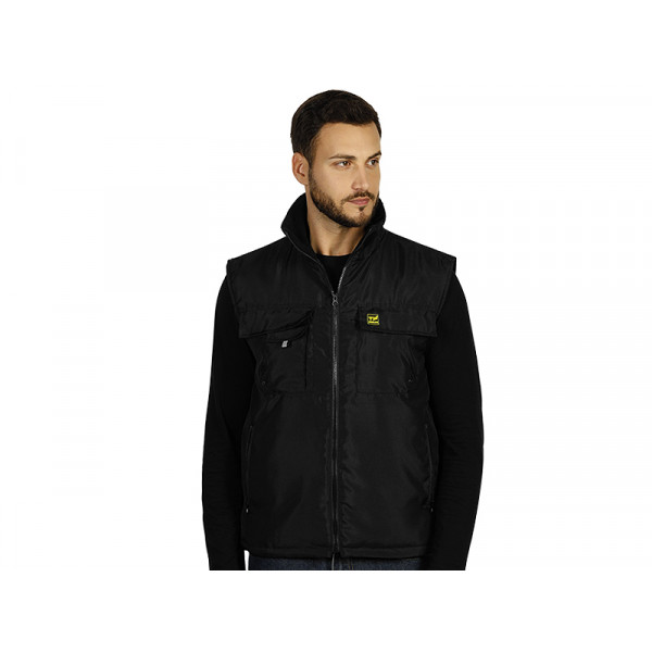 Bodywarmer, high collar, back panel longer than the front, fully zippered, five pockets, three of which with flap and velcro, two big pockets with covered zip, big pocket for mobile phone, one pocket inside, zipper on the inside back for easier printing access