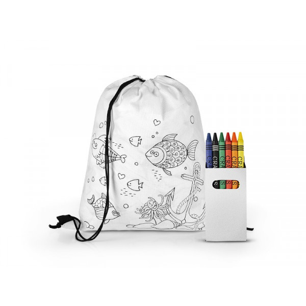 Biodegradable coloring drawstring bag (adjustable drawstrings) with crayons, for kids