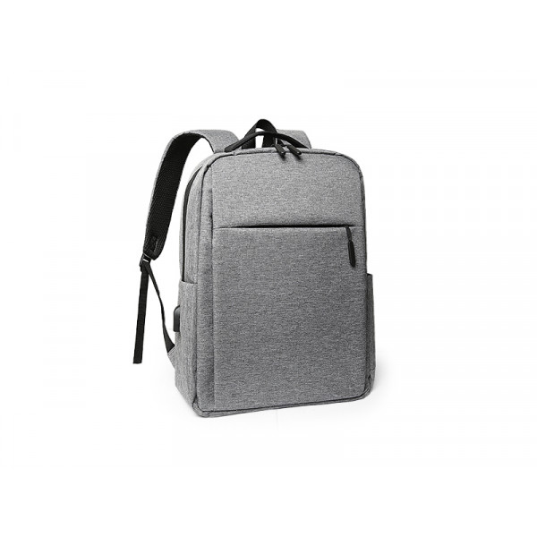 Backpack with one main compartment, two front pockets with zipper, padded compartment for 15" laptop, two side pockets, USB connector