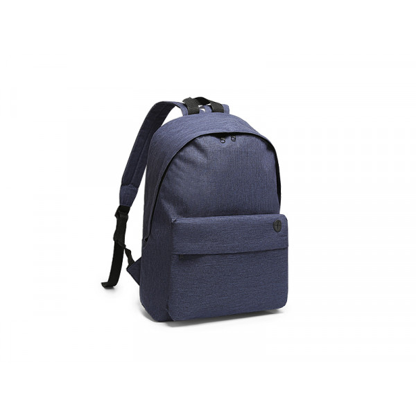Backpack with one main compartment and front pocket with zipper, padded back, earbud hole