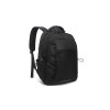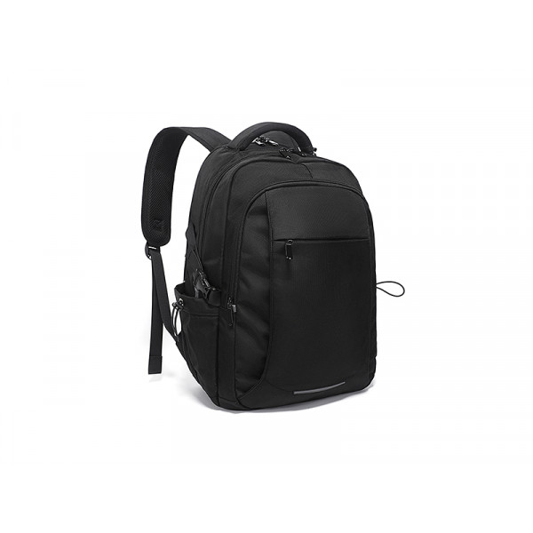Backpack with three main compartments, padded compartment for 15" laptop, tablet compartment, front pocket with zipper, two side pockets, USB connector, secret pocket with zipper on the back